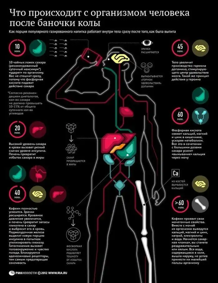 Что на самом деле происходит с организмом в течение часа после того, как вы выпили баночку "Кока-Колы"?