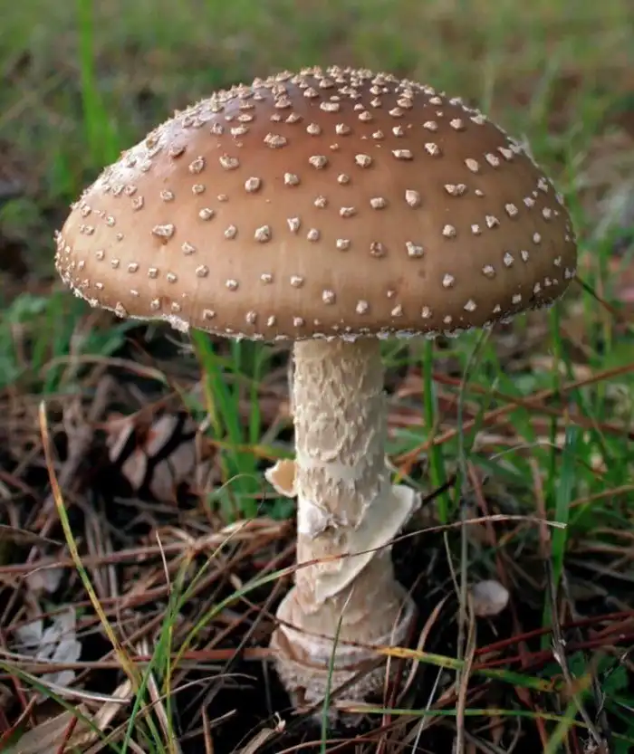 Шляпка у него коричневатая, бывает также бурой, серой, на ней имеются белые точки, которые можно легко сбить со шляпки. Токсичность гриба высокая, шансы выжить зависят от количества съеденного и скорости оказания медицинской помощи. Необходима срочная госпитализация и медицинская помощь.