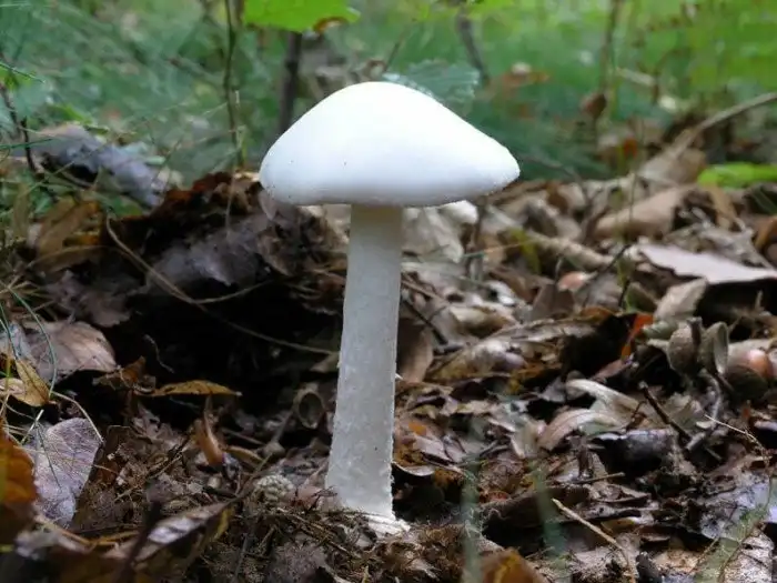 Растет с июня по ноябрь, имеет белый цвет и коническую шляпку, любит сырые места. У белой поганки тонкая ножка, шляпка покрыта слизью. Для сильного отравления достаточно небольшого кусочка, прием которого приводит к болям в животе, сильному слюноотделению, судорогам.