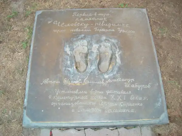 - В Екатеринбурге есть памятник Человеку-невидимке. Авторы проекта, литератор Евгений Касимов и художник Александр Шабуров, придумали, как изобразить этого героя: в виде отпечатков босых ног. Примечательно, что ступни разного размера: каждый художник решил увековечить себя в этом монументе.