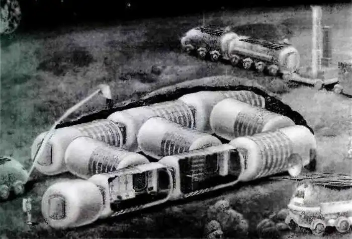 Оригинальным способом были предусмотрены поездки по Луне. Если небольшие транспортные машины должны были получать питание от солнечных батарей и аккумуляторов, то для транспортировки крупногабаритных грузов, даже модулей станции (их планировалось поставить на колеса) работники Бармина планировали создать настоящий «лунный поезд», который имел бы мотору на каждое из колес. Выход из строя нескольких моторов не помешал бы такому транспорту передвигаться. Энергетическая установка этого агрегата должна была вырабатывать мощность в 10 кВт, энергию планировалось получать от радиоактивных изотопов. Полная масса «лунного поезда» рассчитывалась в районе 8 тонн.