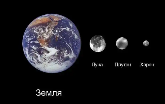 Плутон в сравнении с Хароном, Луной и Землей. Менее 1% от массы и размеров нашей планеты