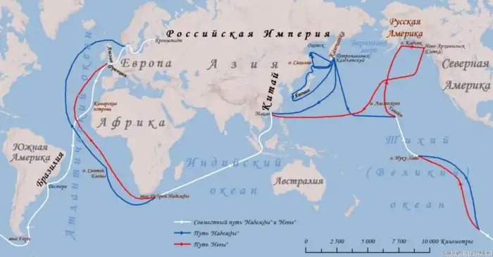 Всё дело было в том, куда эти корабли отправлялись. Хотя русский флот существовал к этому моменту уже больше ста лет и был прославлен и победами в сражениях, и смелыми плаваниями, в этот день «Надежда» и «Нева» начинали первое в истории русского флота кругосветное плавание.