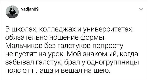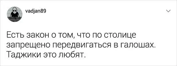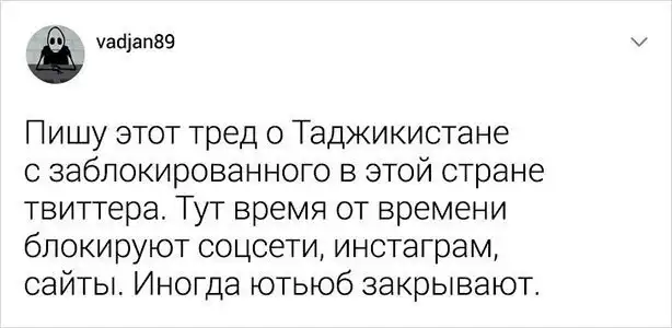 Пользователь твиттера "vadjan89" родился в России, но уже много лет живет в Таджикистане. За время проживания в этой стране он познакомился с множеством непривычных традиций, которые бы шокировали любого европейца. Свои мысли и наблюдения он публикует в твиттере.