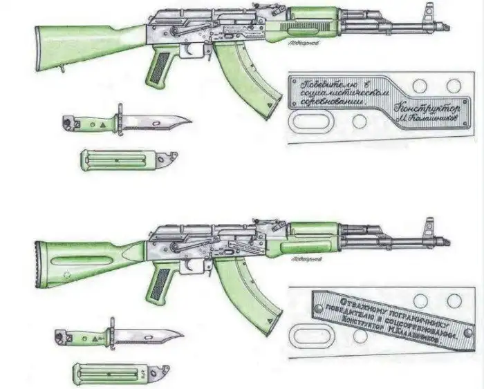 Этой пластиковой фурнитурой, выполненной в зелёном цвете, было решено украсить ограниченную серию 7,62-мм автоматов Калашникова модернизированных, которая предназначалась для награждения советских пограничников, особо проявивших себя в защите рубежей страны.