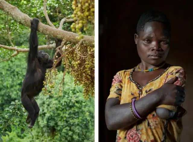 Шимпанзе, потерявший обе стопы в человеческих ловушках и Тедди Атухайре, потерявшая руку из-за нападения примата.