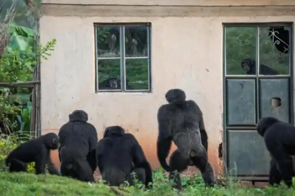 Шимпанзе смотрят в окна фермы, которую Нтегека Семата покинула вместе со своей семьей.