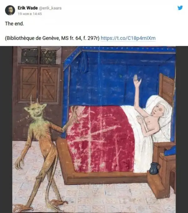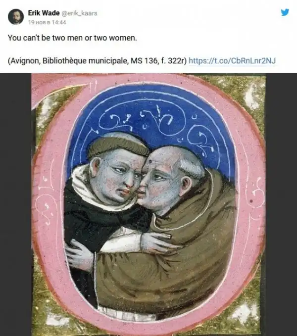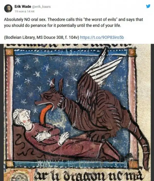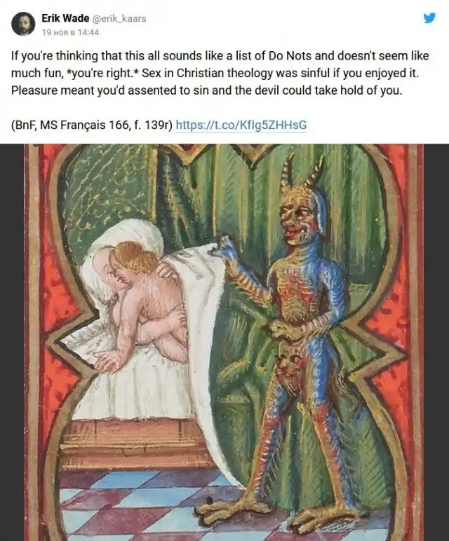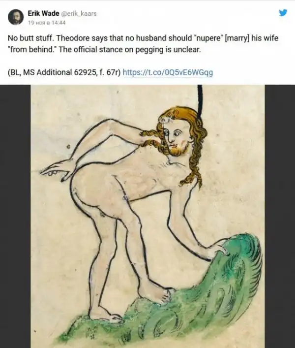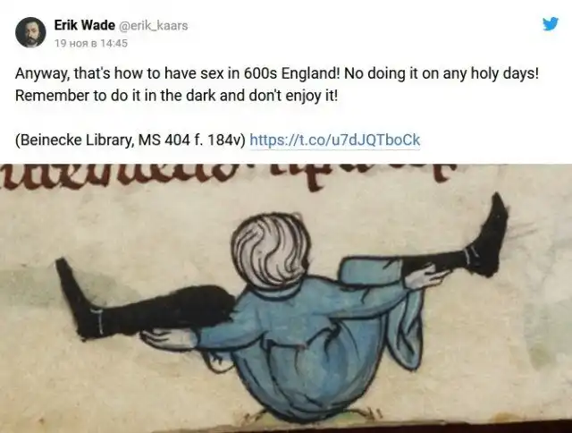 В ноябре Вейд рассказал о том, какие в Средневековье существовали рекомендации по поводу занятия сексом. В треде он ссылается на английского архиепископа Теодора, который жил в седьмом веке и составил правила того, как «уместно» заниматься сексом. Рассказ историк подкрепил реальными иллюстрациями тех времён.