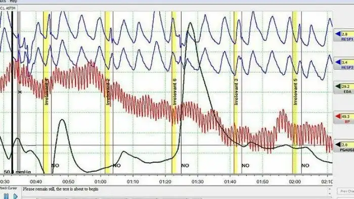 Детектор лжи или полиграф работает путем измерения физиологических изменений в организме, он фиксирует частоту дыхания и пульса, артериальное давление, гальваническую реакцию кожи, изменения в зрачках и в некоторых случаях активность мозга.