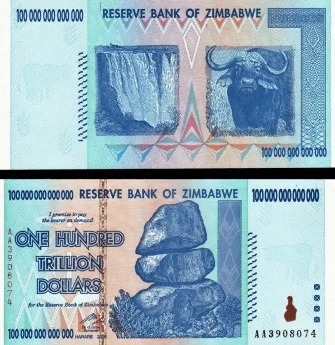 Банкнота с самым крупным в мире номиналом — 100 триллионов зимбабвийских долларов