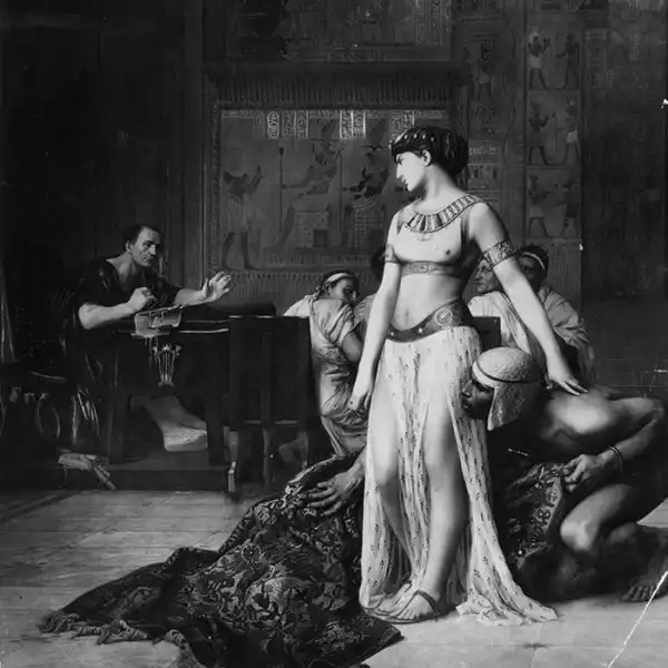 После убийства Цезаря Клеопатре был нужен новый союзник, и выбор ее пал на Марка Антония. Он несколько раз вызывал ее к себе, но Клеопатра показала, что она сама выбирает, когда входить к мужчине. Она явилась перед ним в «ладье с позолоченной кормой с фиолетовыми парусами, гребцы гребли серебряными веслами под звуки флейты». А сама Клеопатра расположилась на ложе с золотым балдахином, одетая как римская Венера. Служанки вокруг изображали нимф.