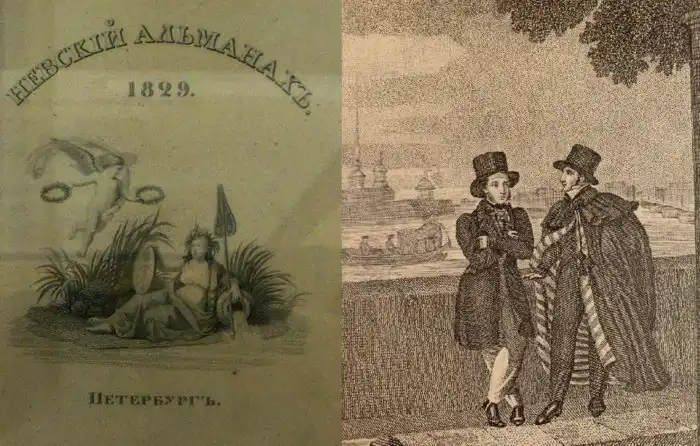 Титул "Невского альманаха" за 1829 год и одна из иллюстраций Нотбека к роману