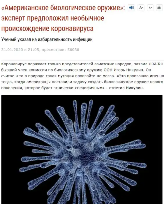 В конце января эксперты в соцсетях, проанализировав информацию по заболевшим коронавирусом, пришли к выводу, что вирус был создан искусственно, и действует он только на китайцев. То есть коронавирус - избирательное биологическое оружие.