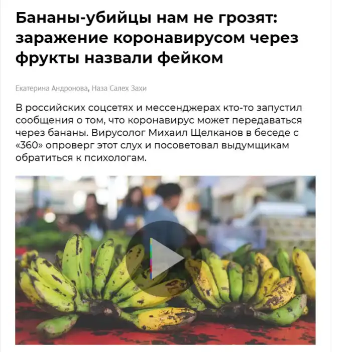 В интервью "360" вирусолог Михаил Щелканов развенчал страшилку из мессенджера: "Это чушь собачья. Сплошной фейк. Те бананы, которыми питаются крыланы в южных провинциях Китая, они не поступают в продажу, думаю, даже в самом Китае, не говоря уже о других странах". Бананы в российских магазинах в основном из Эквадора, где ещё даже не было зафиксировано случаев заражения коронавирусом.