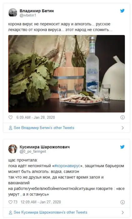 Также по соцсетям разошлась информация, что коронавирус лечится алкоголем. Говорят, что в пожилые китайцы охотно верят утке и регулярно лечатся алкоголем.