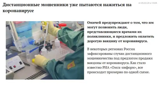 В некоторых регионах России гражданам звонят мошенники и предлагают срочно купить поступившую в поликлинику в ограниченном количестве прививку от коронавируса. Звонят преимущественно пенсионерам, представляются именами врачей из местных больниц. Никакой вакцины от коронавируса пока не изобрели, будьте бдительны.