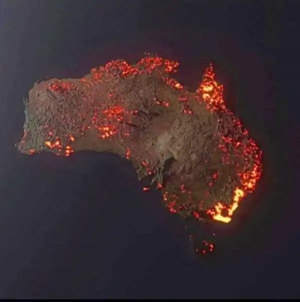 Это снимок выдается как фото горящей Австралии из космоса. На самом деле это работа Аnthony Hearsey – 3D-визуализация очагов возгорания за месячный период: