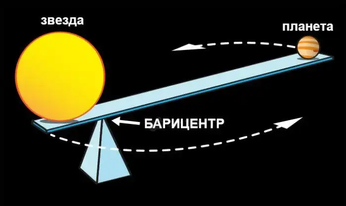 В нашей Солнечной Системе всё происходит в точности так же: Солнце и каждая из планет вращаются вместе вокруг общего барицентра. Например, планета Юпитер настолько массивна, что барицентр системы «Солнце+Юпитер» расположен приблизительно в 45000 километрах над поверхностью Солнца.