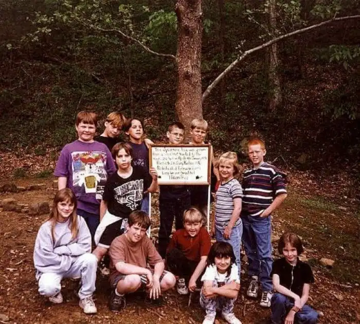 Ученики третьего класса Джоан Гобл с табличкой, которую они сделали для лунного дерева в Каннелтоне, штат Индиана. Благодаря письму Гобл начали разыскивать другие такие деревья по всему миру. Источник изображения: nasa.gov