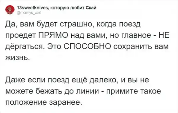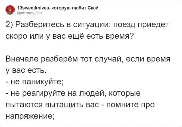 Не все треды в Твиттере - это смешные и дурацкие фантазии пользователей. Некоторые из них посвящены действительно серьезным вещам. В данном случае пользовательница Твиттера решила рассказать, как выжить после падения на рельсы в метро.