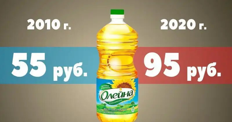 Масло растительное "Олейна", 1 л, сегодня в "Ашане" продается по цене 95 рублей, а в 2010 там же оно стоило - 55 рублей.