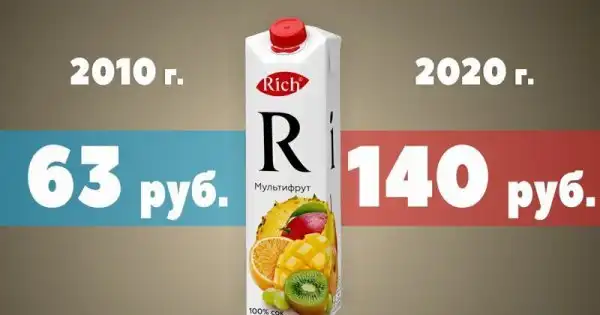 Cок Rich без акции стоит сегодня около 140. А вот в 2010 году 1 литр этого напитка обходился россиянам в 63 рубля.