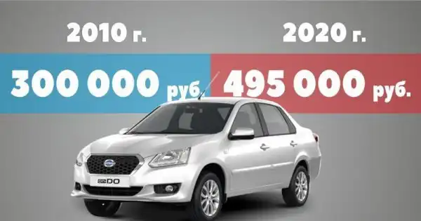 Давайте сравним цены на авто, все знают, что сегодня их цена отличается от той, которая была 10 лет назад. Например, DATSUN ON-DO из салона в 2010 году можно было приобрести за 300 тыс рублей, сегодня же рекомендованная розничная цена - от 490 000 ₽.