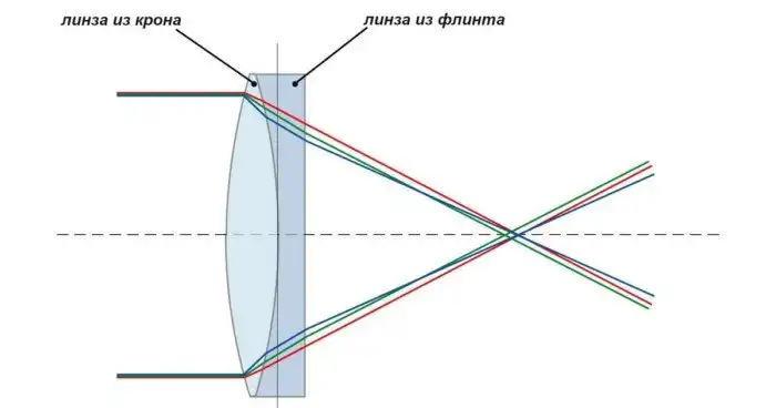 Однако шло время, совершенствовались технологии стекловарения. Оптики научились получать разные сорта стекла для линз и делать линзы с разными свойствами... Ближе к середине XVIII века английский учёный Честер Холл, проведя тщательные расчёты, понял: если сделать линзу не одинарной (из одного сорта стекла), а двойной, то можно подобрать характеристики так, чтобы раз и навсегда убрать хроматическую аберрацию; во всяком случае, снизить её настолько, чтобы она перестала мешать наблюдениям! Переднюю линзу нужно было изготовить из лёгкого стекла (крона), заднюю – из тяжёлого (флинта), каждая из линз искажала изображение, но вместе искажения исчезали – как сейчас модно говорить, «плюс на минус будет ноль».