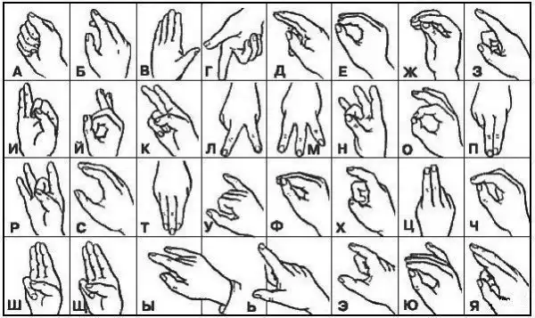 В жестовом языке для каждого слова существует отдельный жест или их комбинация. Например «книга» + «девочка» + «принадлежность» — «книга девочки». А с помощью дактильной азбуки проговариваются отдельные буквы, вспомогательные слова («а», «ну»), а также слова, для которых нет представления в жестовом языке.