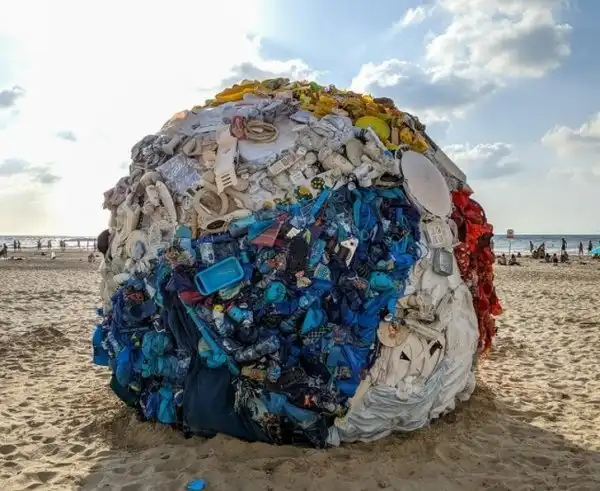 Этот мяч сделан из пластика, чтобы напомнить людям о необходимости убирать за собой мусор на пляже