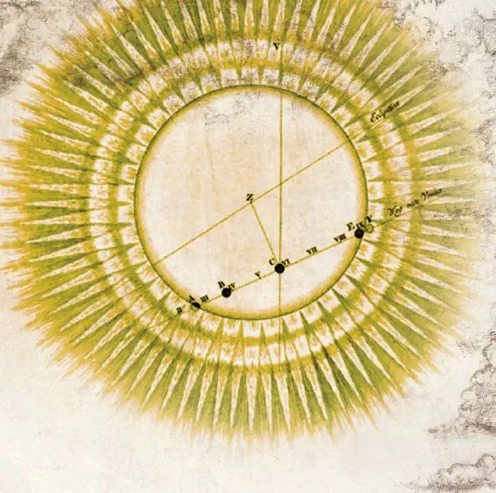 А теперь отступление. В 1663 году ученый из Шотландии Джеймс Грегори предложил способ измерения расстояния от Земли до Солнца. При этом требовалось наблюдать прохождение Венеры по диску Солнца и измерить продолжительность этого события. Это вполне согласовывалось с законами космической механики, беда только в том, что по этим же законам космической механики Венера проходит по диску Солнца для земного наблюдателя 2 раза с промежутком 8 лет, а затем этого явления нужно ждать более столетия.