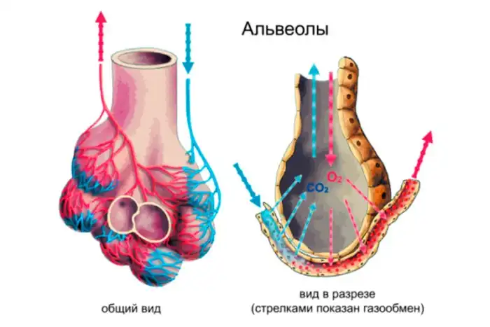Удаление этих продуктов проходит через те же самые альвеолы: углекислый газ меняется местами с кислородом, и выходит наружу в процессе выдоха.