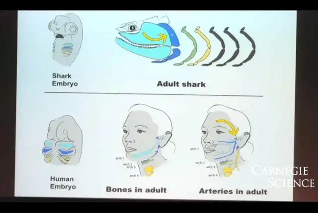 В своём доказательстве он сравнивает эмбрионы акулы и человека, которые на первый взгляд не выглядят такими уж разными. Далее он разными цветами обозначил части у обоих эмбирионов и показал, чем они становятся после развития.