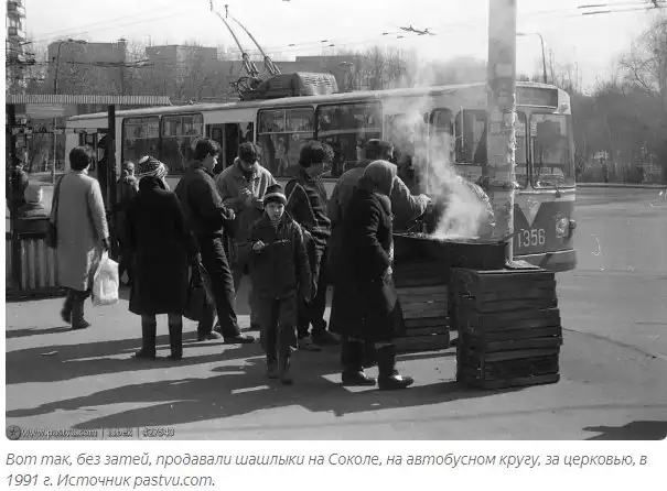 Тогда же у Савеловского вокзала появились первые «кооперативные» шашлыки. Небольшая порция на отечественной бумажной тарелке, а то и картонке, с ложкой ткемали, двумя ломтиками черного хлеба и бутылкой пива обходилась в трояк. Безумно вкусно и, главное, с потрясающим запахом, я обычно не мог удержаться и регулярно портил себе желудок.