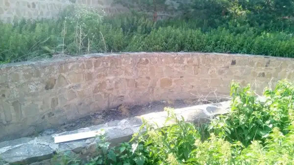 внутри периметра стены всё очень сильно заросло травой , но парочку декоративных прудов , один сухой, другой затянутый тиной, мы нашли..так был ещё фонтан, о котором говорится в репортаже и клумбы, полисаднички, и прочие элементы ландшафного дизайна.