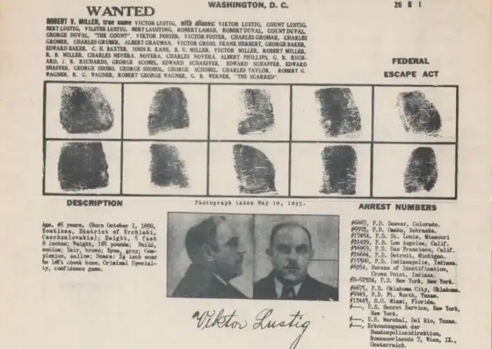 Люстиг сдал своих партнеров- фальшивомонетчиков, а через какое-то время уже у него самого обнаружился целый сейф с поддельными купюрами. Впрочем, Люстиг не был бы самим собой, если бы не попытался выкрутиться и из этой ситуации. За день до начала судебного процесса он притворился больным и был переведен в медицинский блок тюрьмы. Изготовив веревку из подручных материалов, проныра сбежал через окно.