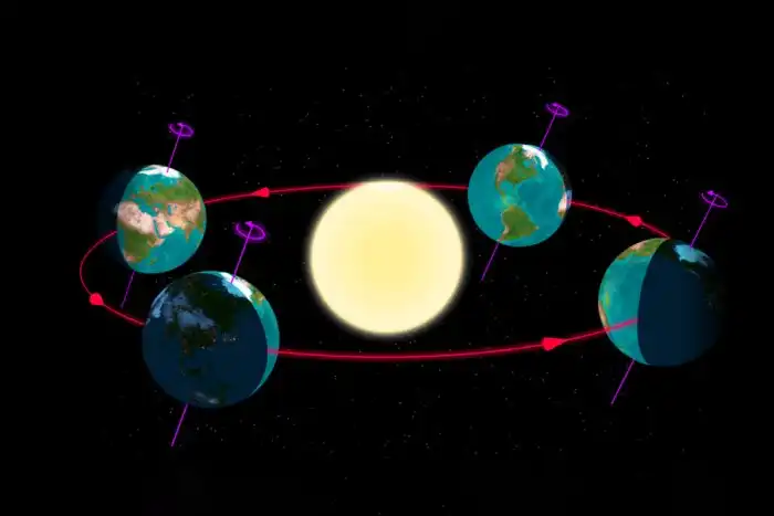 Как раз за один полный поворот Земли вокруг своей оси и происходит смена дня и ночи. А за время, которое требуется на полный оборот вокруг нашей звезды, происходит смена сезонов года и, соответственно, проходит год.