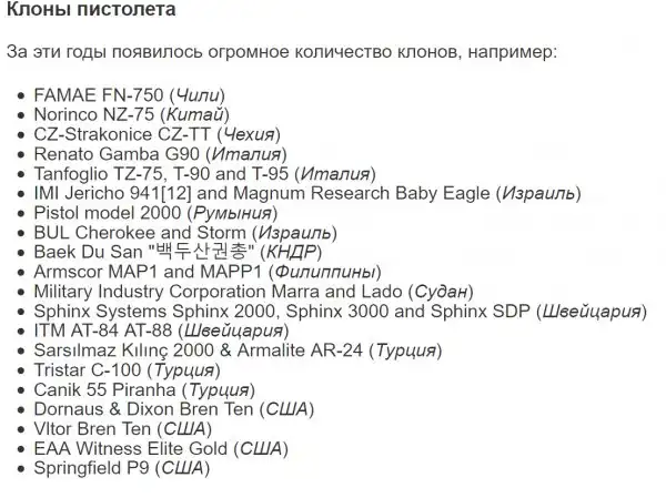 Конструкция пистолета оказалась очень удачной. Его адаптировали также под патроны 40 S&W и 9 × 21 мм IMI.