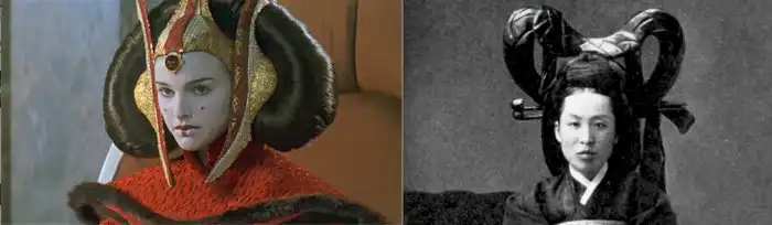 Героиня Натали Портман в I—III эпизодах «Звездных войн» — это сказочная вариация на тему знаменитой королевы Мин, правительницы Кореи в конце XIX века. Во-первых, в «Скрытой угрозе» она носит традиционные для монгольской и корейской аристократии костюмы, важной составляющей которых являются длинные «рога».