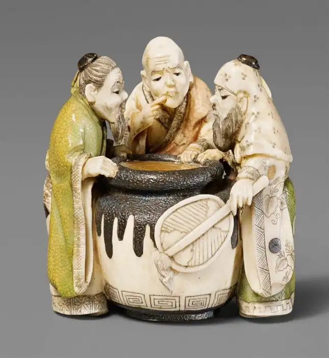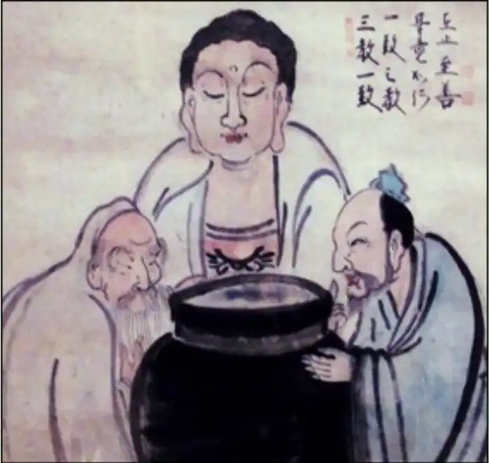 Если вам доведётся побывать в Китае или Японии, вы обязательно наткнётесь на картины или скульптуры, изображающие трёх пожилых мужчин, стоящих вокруг большого кувшина или бочки с какой-то жидкостью.