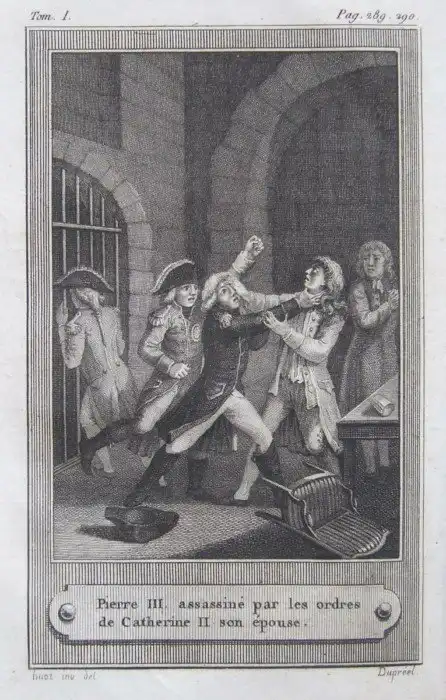В итоге через каких-то полгода эти же офицеры устроили в сущности националистический переворот, возвели на трон жену Петра Третьего Екатерину Вторую, а посаженного под арест Петра Третьего случайно задушили в пьяной драке.