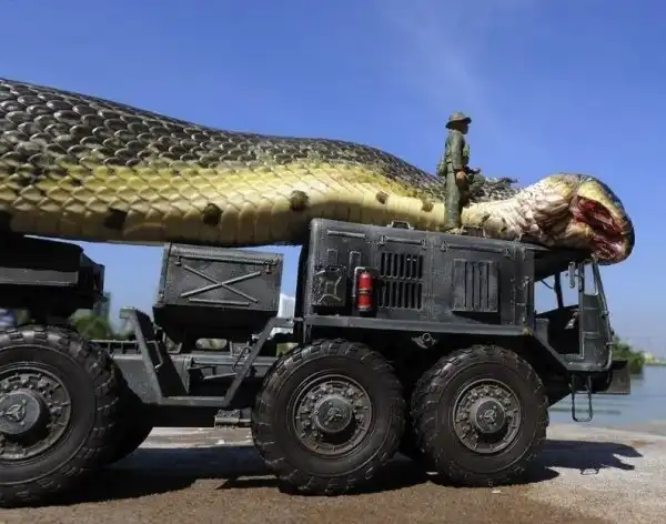 На самом деле змея обычная, машинка игрушечная, а солдаты пластмассовые. Змею жалко, убили для фейка