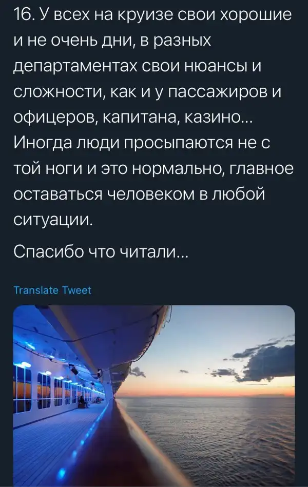 Пользователь Твиттера устроил небольшой, но весьма познавательный тред о работе на круизном судне. Парень довольно детально описал свои рабочие будни. Давайте посмотрим. Кстати, а вы когда-нибудь отдыхали на круизном лайнере?