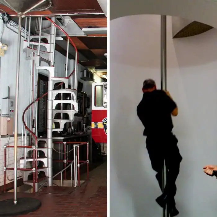 Пожарные словно не ищут легких путей: поселились на втором этаже, установили неудобные винтовые лестницы, а потом придумали столб для спуска, чтобы быстро миновать эти трудности, когда потребуется их помощь. Это не мазохизм, а способ помешать лошадям добраться до жилых помещений, ведь именно на них раньше пожарным приходилось отправляться на задание. Когда животные чувствовали запах еды, они пытались пойти разузнать, в чем там дело. Сегодня многие пожарные станции устроены так же просто потому, что идея хорошо прижилась.