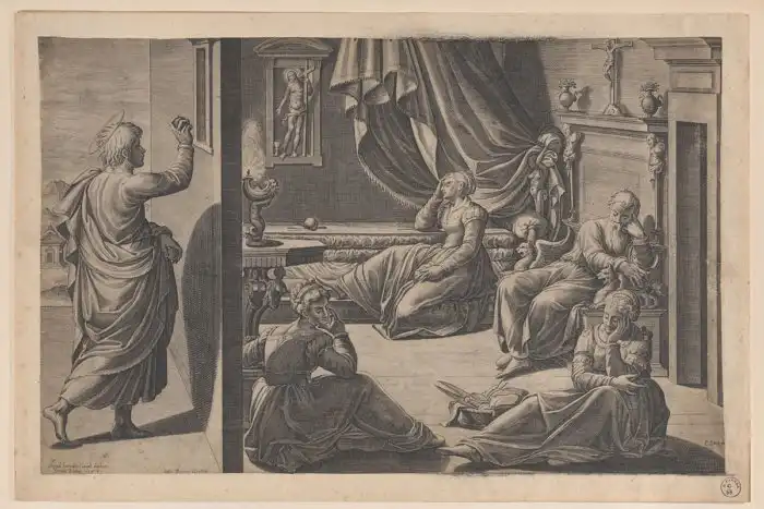 Святой Николай подбрасывает мешок денег бедным девушкам. Гравюра 1587 г.