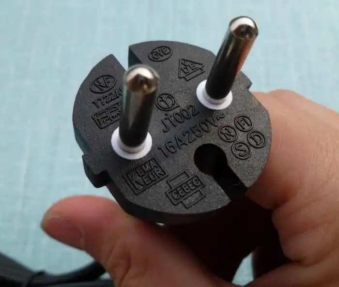 Это привычная нам розетка с заземляющими контактами в виде скоб. К ней имеется и специальная вилка, на которой сверху и снизу имеются два контакта.
