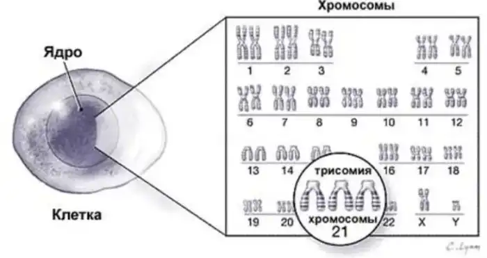 У обычного человека в клетках по 23 парные хромосомы — всего 46 хромосом. Но у людей с синдромом Дауна в 21-й паре содержится дополнительная третья (так называемая трисомия), а всего в клетках человека оказывается 47 хромосом. Возможен вариант, когда присутствует не целая «лишняя» хромосома, а только некоторые ее фрагменты.