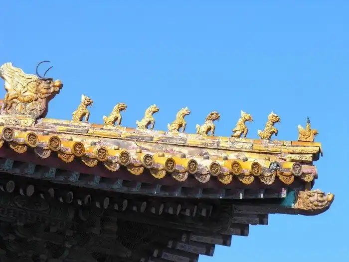 Крыши почти всех строений Запретного города покрыты черепицей золотого цвета, поскольку золотой - цвет императора. Цвет крыши отличается лишь у библиотеки и покоев наследного принца. Крыша библиотеки - черного цвета, поскольку черный цвет в Китае ассоциируется с вобой, и строители надеялись, что черный цвет поможет отвести от здания пожар. Крыша покоев принца - зеленая, ведь зеленый - цвет роста.
