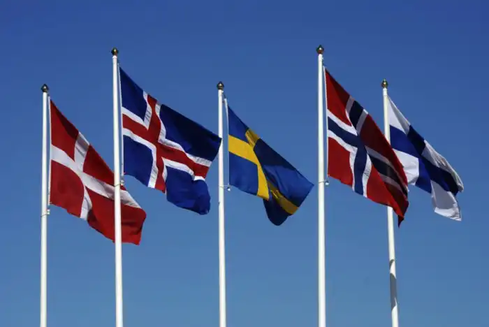 Флаги по порядку: Дания, Исландия, Швеция, Норвегия, Финдляндия