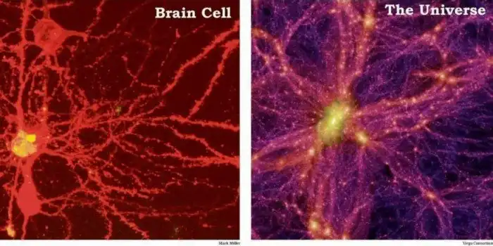 Слева клетка мозга. Справа структура всленной в масштабе 125 мегапрсек : 1 см